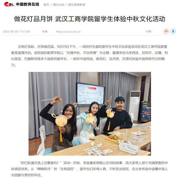 据悉,国际教育学院始终致力于将传统节日打造为促进中外文明互鉴、情感相连的文化纽带。此次中秋活动,正是这一理念的生动实践——它不仅让留学生沉浸式地感知了中国传统文化的魅力,更在他们亲手制作玉兔灯、分享家乡习俗的过程中,搭建起一座文化交流互通的桥梁。未来,学院还将继续策划一系列中国传统节日文化体验活动,打造一个更立体、多元的“感知中国”文化平台,让每一位留学生都能成为文化交流的使者,将中国的传统文化传播到世界各地。(通讯员:闻珂)