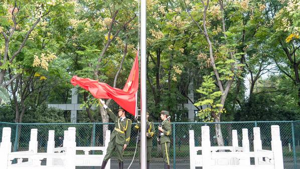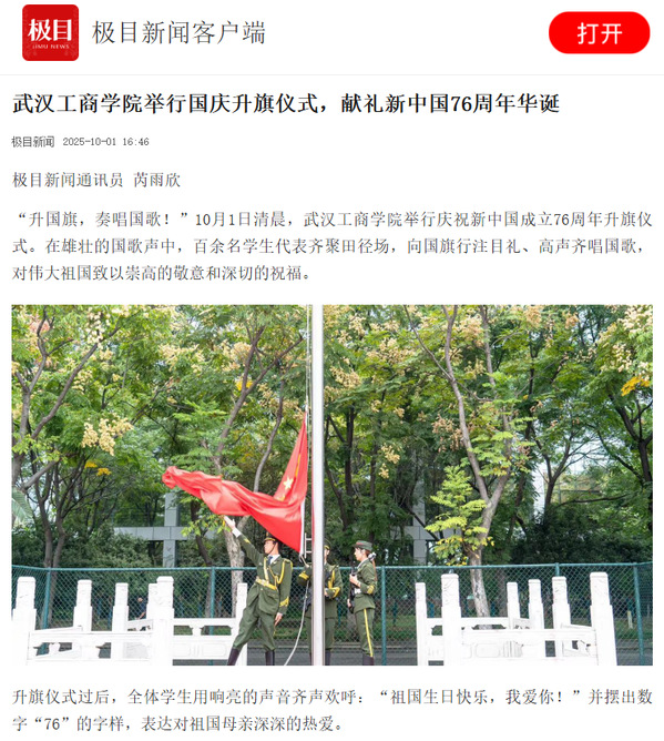 “升国旗,奏唱国歌!”10月1日清晨,武汉工商学院举行庆祝新中国成立76周年升旗仪式。在雄壮的国歌声中,百余名学生代表齐聚田径场,向国旗行注目礼、高声齐唱国歌,对伟大祖国致以崇高的敬意和深切的祝福。