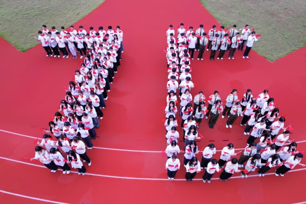 升旗仪式过后,全体学生用响亮的声音齐声欢呼:“祖国生日快乐,我爱你!”并摆出数字“76”的字样,表达对祖国母亲深深的热爱。