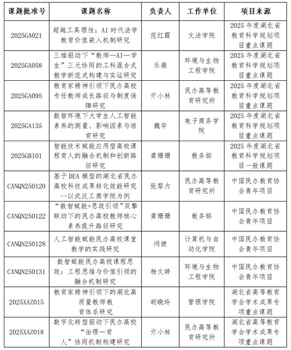 新闻中心讯(特约记者 张黎力)近日,武汉工商学院喜报频传,在民办高等教育研究领域多项申报课题成功获批立项,涵盖湖北省教育科学规划课题、中国民办教育协会规划青年课题及湖北省高等教育学会教育科研重点项目,充分彰显了学校在民办高等教育领域的科研实力与创新活力。