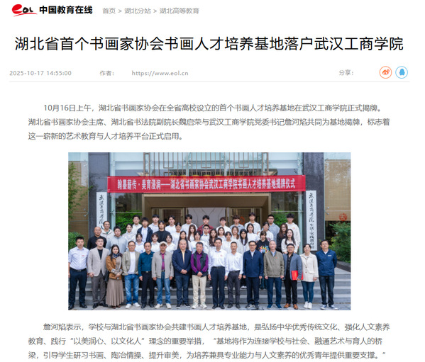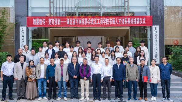10月16日上午,湖北省书画家协会在全省高校设立的首个书画人才培养基地在武汉工商学院正式揭牌。湖北省书画家协会主席、湖北省书法院副院长魏启荣与武汉工商学院党委书记詹河焰共同为基地揭牌,标志着这一崭新的艺术教育与人才培养平台正式启用。
