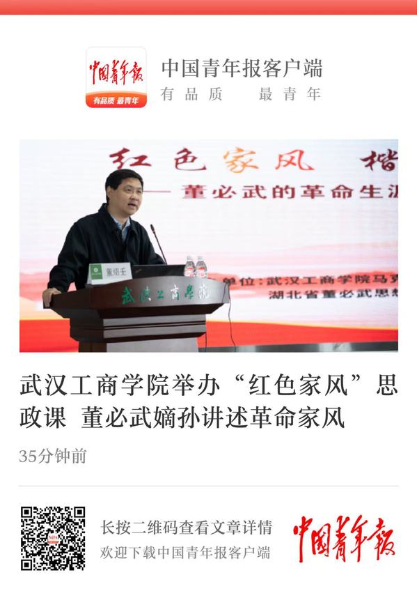 10月23日,武汉工商学院体育中心报告厅座无虚席,一堂以“红色家风 楷模传承”为主题的思政课在此开讲。董必武同志嫡孙、湖北省董必武思想研究会会长董绍壬应邀走进校园,以《董必武的革命生涯与家风故事》为题作专题讲座。