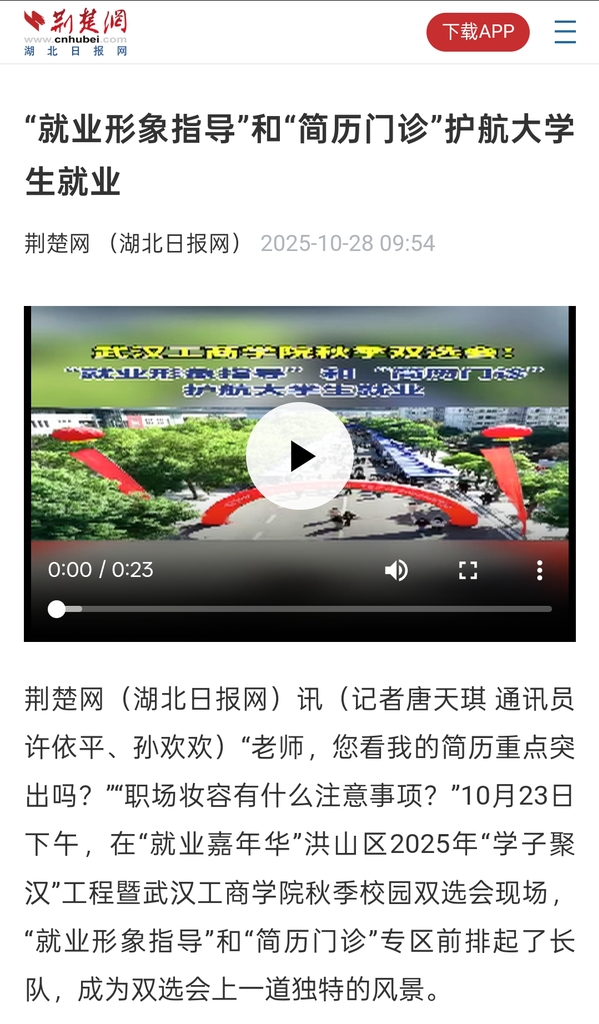 荆楚网(湖北日报网)讯(记者唐天琪 通讯员许依平、孙欢欢)“老师,您看我的简历重点突出吗?”“职场妆容有什么注意事项?”10月23日下午,在“就业嘉年华”洪山区2025年“学子聚汉”工程暨武汉工商学院秋季校园双选会现场,“就业形象指导”和“简历门诊”专区前排起了长队,成为双选会上一道独特的风景。