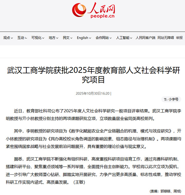 近日,教育部社科司公布了2025年度人文社会科学研究一般项目评审结果。武汉工商学院李明教授与亓小林教授分别主持的两项课题获批立项,立项数量居全省同类高校前列。
