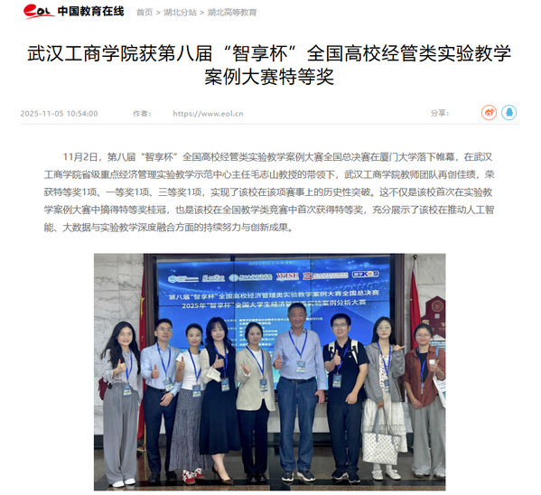 11月2日,第八届“智享杯”全国高校经管类实验教学案例大赛全国总决赛在厦门大学落下帷幕,在武汉工商学院省级重点经济管理实验教学示范中心主任毛志山教授的带领下,武汉工商学院教师团队再创佳绩,荣获特等奖1项、一等奖1项、三等奖1项,实现了该校在该项赛事上的历史性突破。这不仅是该校首次在实验教学案例大赛中摘得特等奖桂冠,也是该校在全国教学类竞赛中首获得特等奖,充分展示了该校在推动人工智能、大数据与实验教学深度融合方面的持续努力与创新成果。