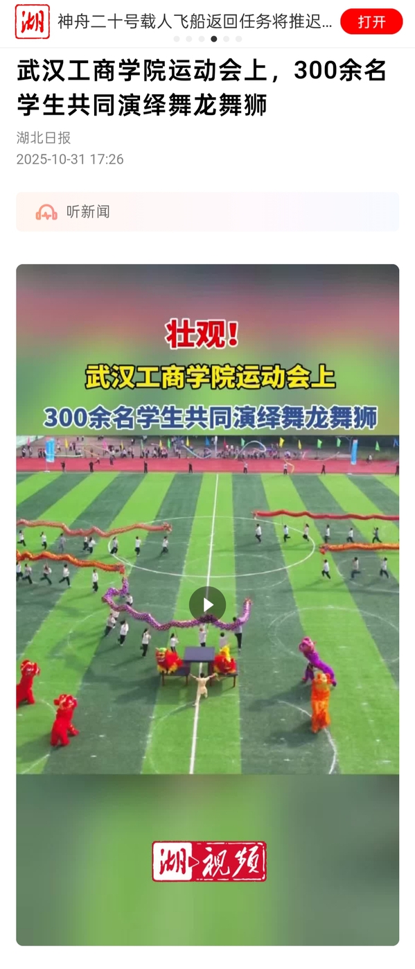 10月31日,在武汉工商学院运动会开幕式上,该校300余名学生带来一场气势恢宏的舞龙舞狮表演。伴随着铿锵的锣鼓节奏,彩龙翻腾起舞,雄狮矫健腾跃,引燃全场气氛。