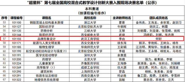 新闻中心讯(特约记者 陈敏)近日,第七届全国高校混合式教学设计创新大赛圆满落幕,武汉工商学院教师团队首次参赛便喜获佳绩,艺术与设计学院李由团队、环境与生物工程学院杨文婷团队分别荣获一等奖,马克思主义学院种爱凤团队获得优胜奖,其中李由团队的《品牌形象设计》课程还直接入围现场决赛,充分彰显了学校在混合式教学领域的建设成效,也展现出参赛教师团队扎实的教学功底与创新的课程设计理念。
