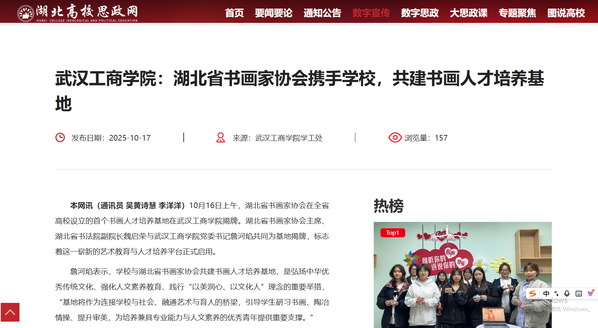 本网讯(通讯员 吴黄诗慧 李洋洋)10月16日上午,湖北省书画家协会在全省高校设立的首个书画人才培养基地在武汉工商学院揭牌。湖北省书画家协会主席、湖北省书法院副院长魏启荣与武汉工商学院党委书记詹河焰共同为基地揭牌,标志着这一崭新的艺术教育与人才培养平台正式启用。