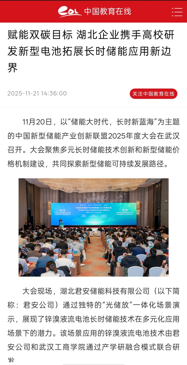 据了解,君安公司与武汉工商学院共建的新能源与储能技术研究院,已通过校企合作模式孵化多项专利技术、推动科研项目落地。同时,该研究院引进华中科技大学樊明武院士团队,建立樊明武院士工作站,正共同开展锌溴液流电池关键技术攻关与产业化应用研究,通过锌溴液流电池规模化发展助力国家“双碳”目标实现。(通讯员:王蕾 蓝静)