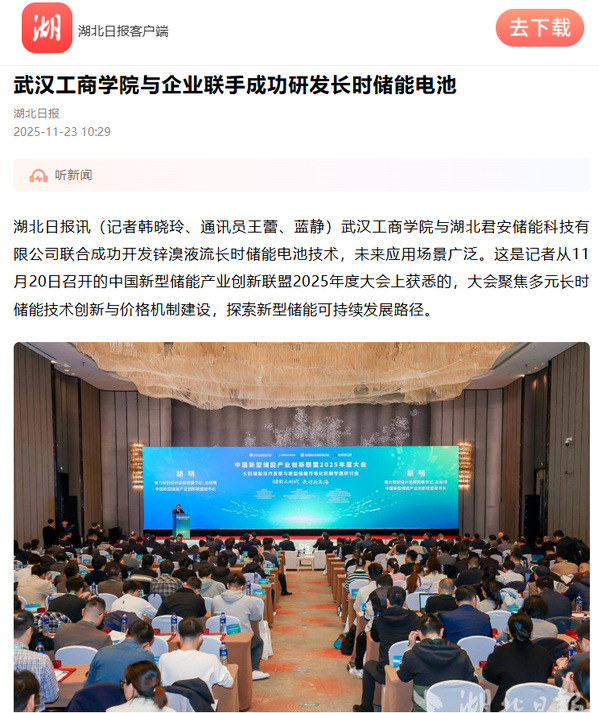 湖北日报讯(记者韩晓玲、通讯员王蕾、蓝静)武汉工商学院与湖北君安储能科技有限公司联合成功开发锌溴液流长时储能电池技术,未来应用场景广泛。这是记者从11月20日召开的中国新型储能产业创新联盟2025年度大会上获悉的,大会聚焦多元长时储能技术创新与价格机制建设,探索新型储能可持续发展路径。