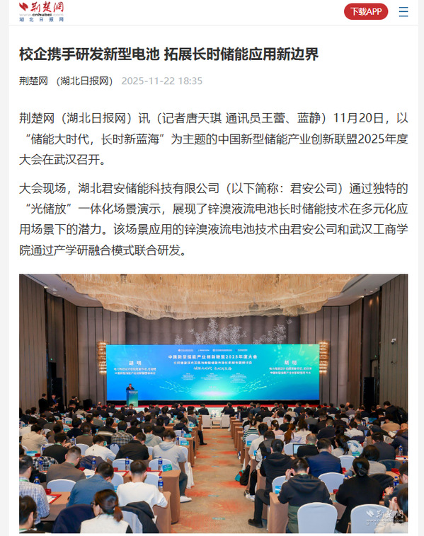 据了解,君安公司与武汉工商学院共建的新能源与储能技术研究院,已通过校企合作模式孵化多项专利技术、推动科研项目落地。同时,该研究院引进华中科技大学樊明武院士团队,建立樊明武院士工作站,正共同开展锌溴液流电池关键技术攻关与产业化应用研究,通过锌溴液流电池规模化发展助力国家双碳目标实现。