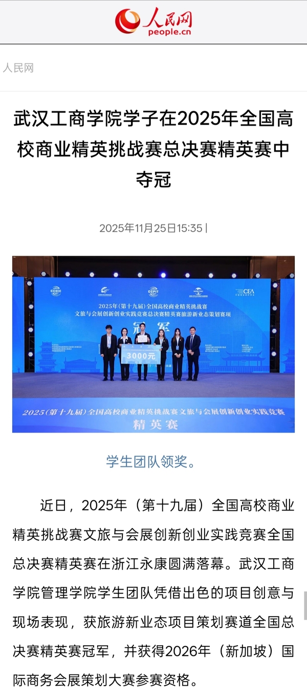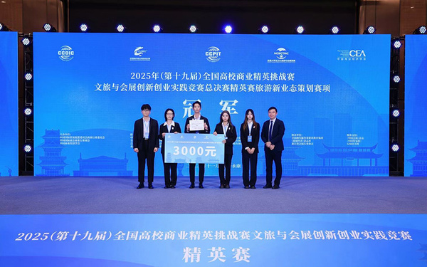 近日,2025年(第十九届)全国高校商业精英挑战赛文旅与会展创新创业实践竞赛全国总决赛精英赛在浙江永康圆满落幕。武汉工商学院管理学院学生团队凭借出色的项目创意与现场表现,获旅游新业态项目策划赛道全国总决赛精英赛冠军,并获得2026年(新加坡)国际商务会展策划大赛参赛资格。