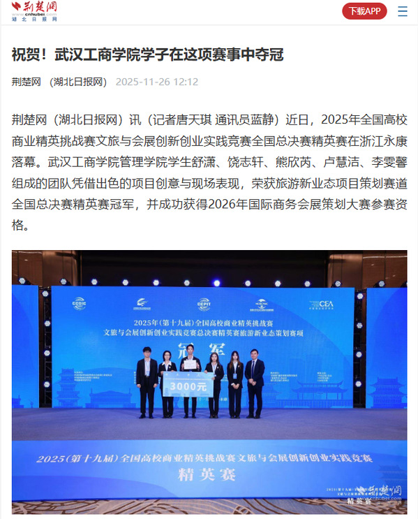 荆楚网(湖北日报网)讯(记者唐天琪 通讯员蓝静)近日,2025年全国高校商业精英挑战赛文旅与会展创新创业实践竞赛全国总决赛精英赛在浙江永康落幕。武汉工商学院管理学院学生舒潇、饶志轩、熊欣芮、卢慧洁、李雯馨组成的团队凭借出色的项目创意与现场表现,荣获旅游新业态项目策划赛道全国总决赛精英赛冠军,并成功获得2026年国际商务会展策划大赛参赛资格。