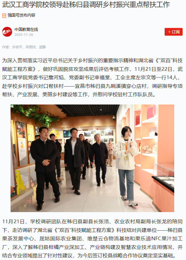 11月21日,学校调研团队在秭归县副县长张浩、农业农村局副局长张龙的陪同下,走访调研了湖北省《“双百”科技赋能工程方案》科技结对共建单位——秭归县果茶发展中心、屈姑国际农业集团、维楚云仓物流基地和果乐迪NFC果汁加工厂,深入了解秭归县柑橘产业深加工、产业链构建及智慧农业技术应用情况,并结合专业领域提出了针对性建议,为今后签订校县战略合作协议奠定坚实基础。