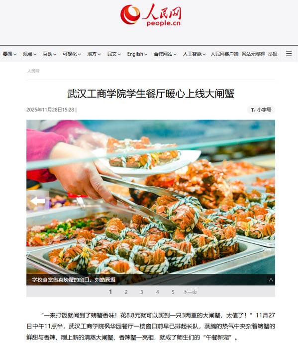“校园餐饮不仅是果腹之需,更是师生幸福感、归属感的重要载体。”学校安全与后勤保障部负责人杨万丽介绍,12月1日起,学校将在其他餐厅也同步推出8.8元一只的低价清蒸大闸蟹、香辣蟹,并且不限购;未来,还会根据时令节气推出更多低价、特色美食,“我们希望通过这些实实在在的举措,让校园成为师生有温度、有滋味的‘第二个家’,让师生在舌尖上感受学校的关怀,在烟火气中凝聚校园温情,持续打造最温暖大学,让‘温暖武工商’品牌更闪亮。”(孙欢欢)