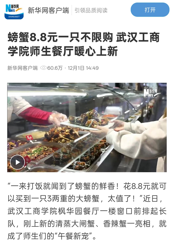 “校园餐饮不仅是果腹之需,更是师生幸福感、归属感的重要载体。”武汉工商学院安全与后勤保障部负责人杨万丽介绍,12月1日起,学校将在其他餐厅同步推出8.8元一只的低价清蒸大闸蟹、香辣蟹,并且不限购。未来,学校还会根据时令节气推出更多低价、特色美食。(孙欢欢)