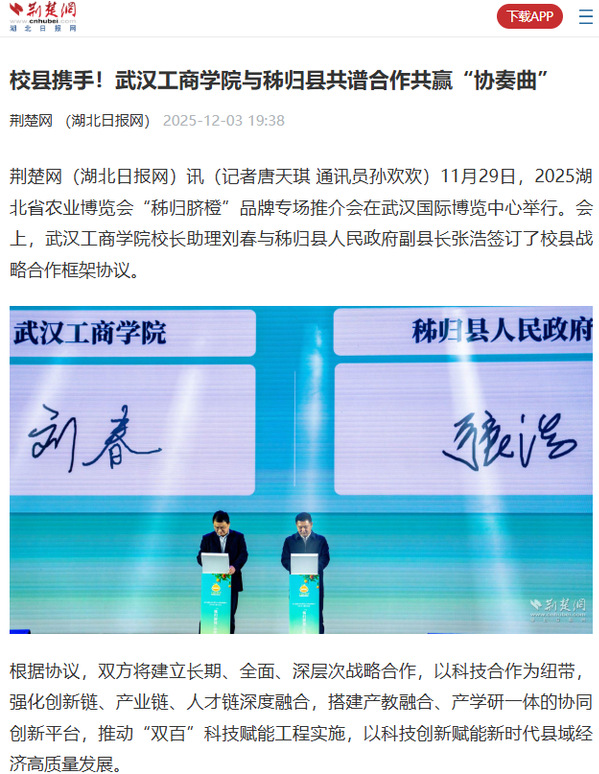 武汉工商学院党委副书记幸福堂表示,此次合作是学校积极服务国家乡村振兴战略、发挥高校资源优势助力新时代县域经济高质量发展的重要举措。他介绍,协议签署前一周,武汉工商学院已专门组队赴秭归县走访调研了学校科技结对共建单位——秭归县果茶发展中心,深入了解当地柑橘产业深加工、产业链构建及智慧农业技术应用情况,并结合专业领域提出了针对性建议,为科技赋能地方特色产业发展奠定基础。秭归县果茶发展中心是学校根据湖北省《“双百”科技赋能工程实施方案》确定的科技结对共建单位。未来,双方将持续深化合作机制,推动科技成果转化与人才培养有机结合,努力打造校地合作助推县域经济发展的示范样板。