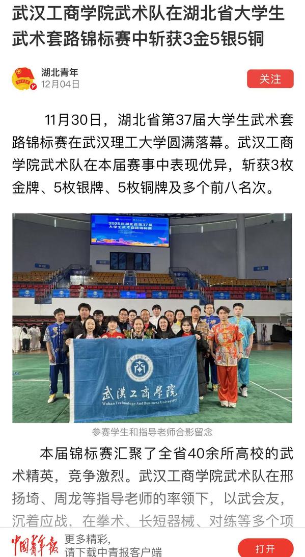 武汉工商学院一贯重视体育工作,积极推动武术等民族传统体育项目的普及与发展。学校公共课部、校团委、校武术协会等协同支持,为学子搭建了强身健体、感悟传统文化的多元平台。此次赛事取得的佳绩,是学校体育教学改革与校园文化建设成效的集中体现。指导老师周龙表示,成绩的取得离不开各方的协同支持,队员们赛场上的突出表现,生动展现了学校体育育人的丰硕成果。