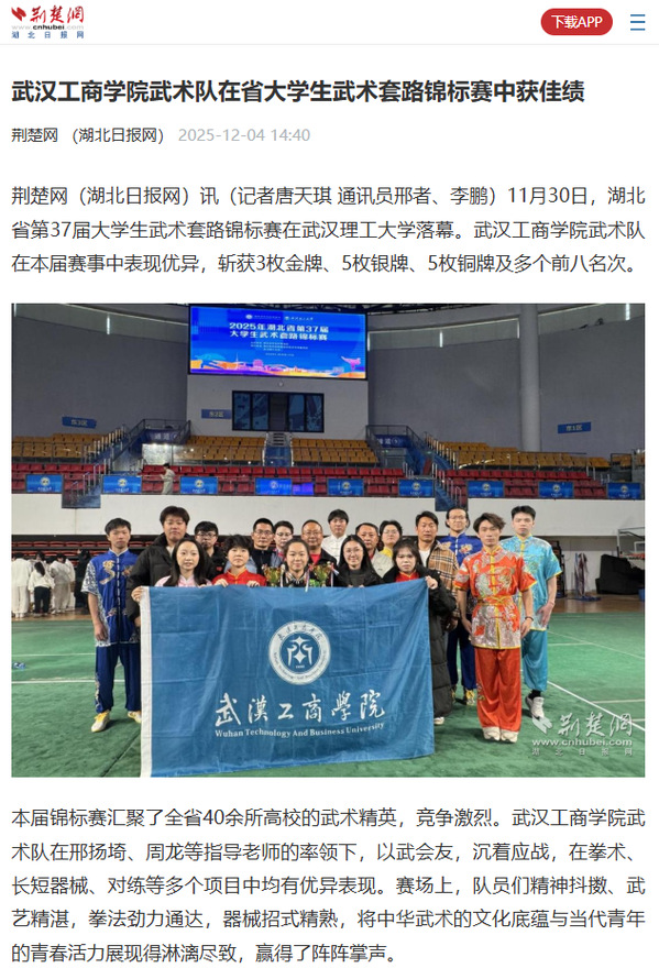武汉工商学院一贯重视体育工作,积极推动武术等民族传统体育项目的普及与发展。学校公共课部、校团委、校武术协会等协同支持,为学子搭建了强身健体、感悟传统文化的多元平台。此次赛事取得的佳绩,是学校体育教学改革与校园文化建设成效的集中体现。指导老师周龙表示,成绩的取得离不开各方的协同支持,队员们赛场上的突出表现生动展现了学校体育育人的丰硕成果。