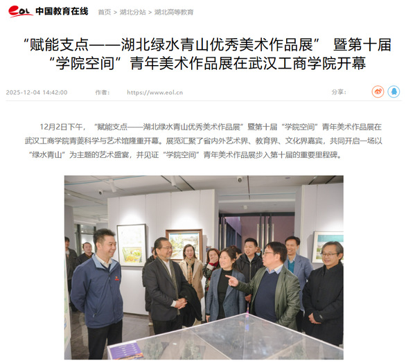 据悉,本次展览由湖北省社会科学界联合会、湖北省教育厅指导,武汉大学国家文化发展研究院、湖北省学院空间艺术研究院等单位主办,武汉工商学院承办。展览将持续至12月30日,面向公众免费开放,旨在为冬日江城献上一场凝聚青春创意、彰显生态之美的艺术盛宴。(通讯员:许依平 蓝静)