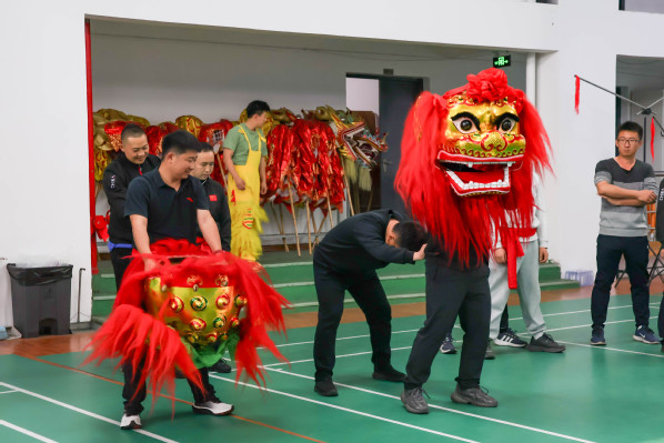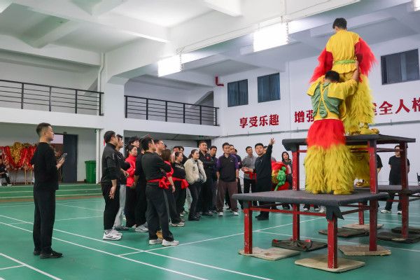 技术实践环节,全体学员在训练场分为北狮、南狮和舞龙三个组别进行专项技能实践与训练,三位讲师亲身示范:王存良教授详细指导了北狮的跨跳、翻滚与高举狮头站立等动作,注重动作的力量与节奏;黄帝全教授从礼仪与基本步伐教起,深入传授南狮传统套路的形神兼备;彭成根副教授则重点训练舞龙的动作连贯性和团队协作,指导学员完成长龙的起伏、龙形变换。训练现场气氛热烈,学员们积极投入,在龙腾狮跃中将理论转化为实践,扎实掌握技术要领,收获满满。