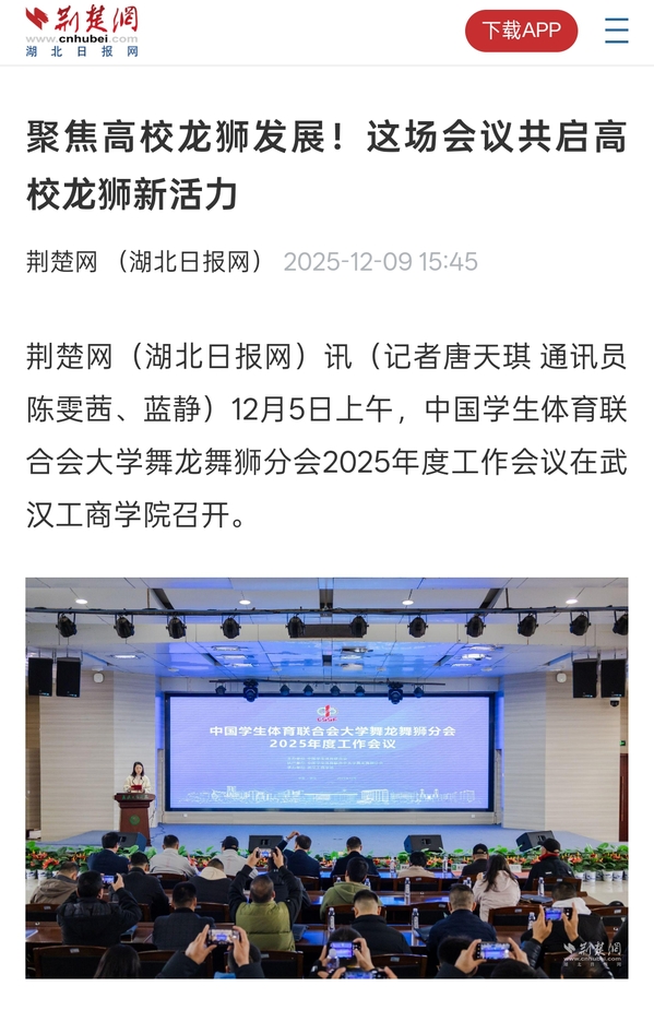 荆楚网(湖北日报网)讯(记者唐天琪 通讯员陈雯茜、蓝静)12月5日上午,中国学生体育联合会大学舞龙舞狮分会2025年度工作会议在武汉工商学院召开。