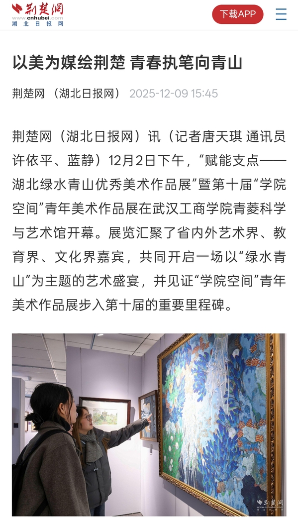 荆楚网(湖北日报网)讯(记者唐天琪 通讯员许依平、蓝静)12月2日下午,“赋能支点——湖北绿水青山优秀美术作品展”暨第十届“学院空间”青年美术作品展在武汉工商学院青菱科学与艺术馆开幕。展览汇聚了省内外艺术界、教育界、文化界嘉宾,共同开启一场以“绿水青山”为主题的艺术盛宴,并见证“学院空间”青年美术作品展步入第十届的重要里程碑。