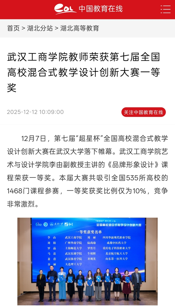 12月7日,第七届“超星杯”全国高校混合式教学设计创新大赛在武汉大学落下帷幕。武汉工商学院艺术与设计学院李由副教授主讲的《品牌形象设计》课程荣获一等奖。本届大赛共吸引全国535所高校的1468门课程参赛,一等奖获奖比例仅为10%,竞争非常激烈。