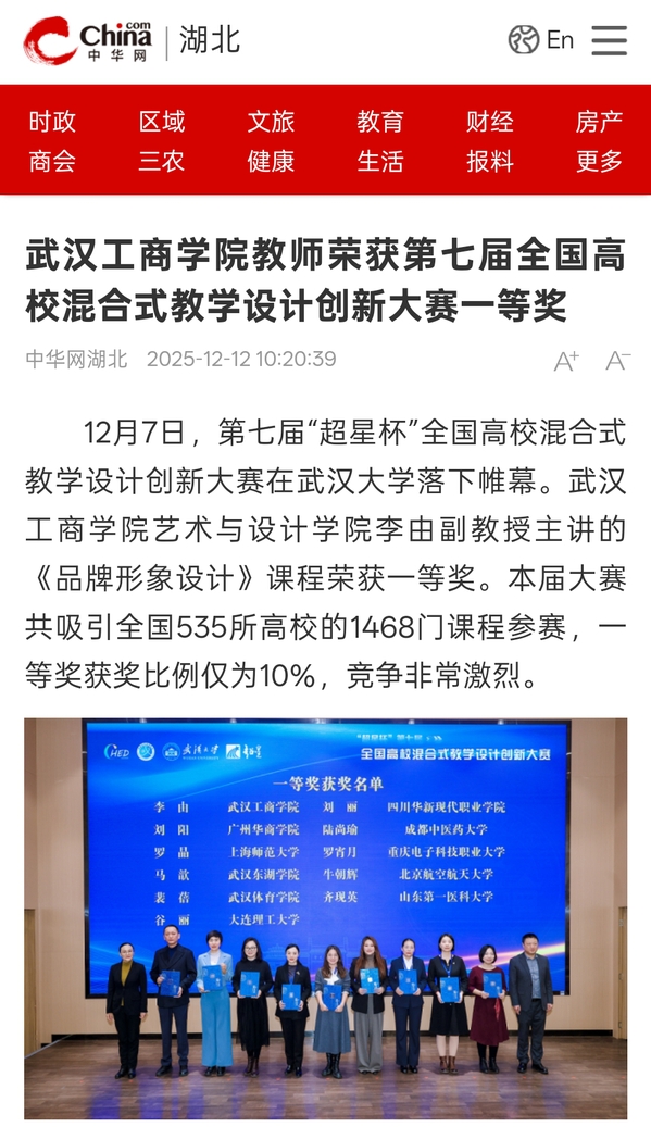 12月7日,第七届“超星杯”全国高校混合式教学设计创新大赛在武汉大学落下帷幕。武汉工商学院艺术与设计学院李由副教授主讲的《品牌形象设计》课程荣获一等奖。本届大赛共吸引全国535所高校的1468门课程参赛,一等奖获奖比例仅为10%,竞争非常激烈。
