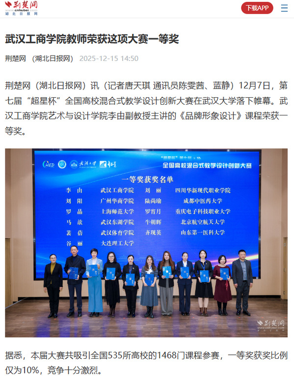 荆楚网(湖北日报网)讯(记者唐天琪 通讯员陈雯茜、蓝静)12月7日,第七届“超星杯”全国高校混合式教学设计创新大赛在武汉大学落下帷幕。武汉工商学院艺术与设计学院李由副教授主讲的《品牌形象设计》课程荣获一等奖。