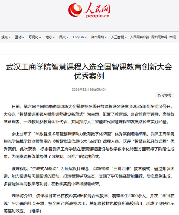 会上公布了“AI数智技术与智慧慕课助力教育数字化转型”优秀案例遴选结果,武汉工商学院物流学院魏学将老师负责的《智慧物流信息技术与应用》课程入选,获评“智慧在线开放课程”优秀案例。此次获奖,标志着武汉工商学院在智慧课程建设与教学数字化转型方面取得了阶段性成果,为同类课程改革提供了可复制、可推广的实践范式。