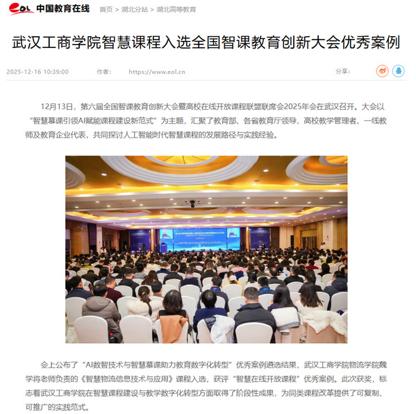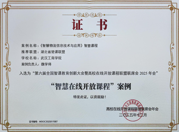 会上公布了“AI数智技术与智慧慕课助力教育数字化转型”优秀案例遴选结果,武汉工商学院物流学院魏学将老师负责的《智慧物流信息技术与应用》课程入选,获评“智慧在线开放课程”优秀案例。此次获奖,标志着武汉工商学院在智慧课程建设与教学数字化转型方面取得了阶段性成果,为同类课程改革提供了可复制、可推广的实践范式。
