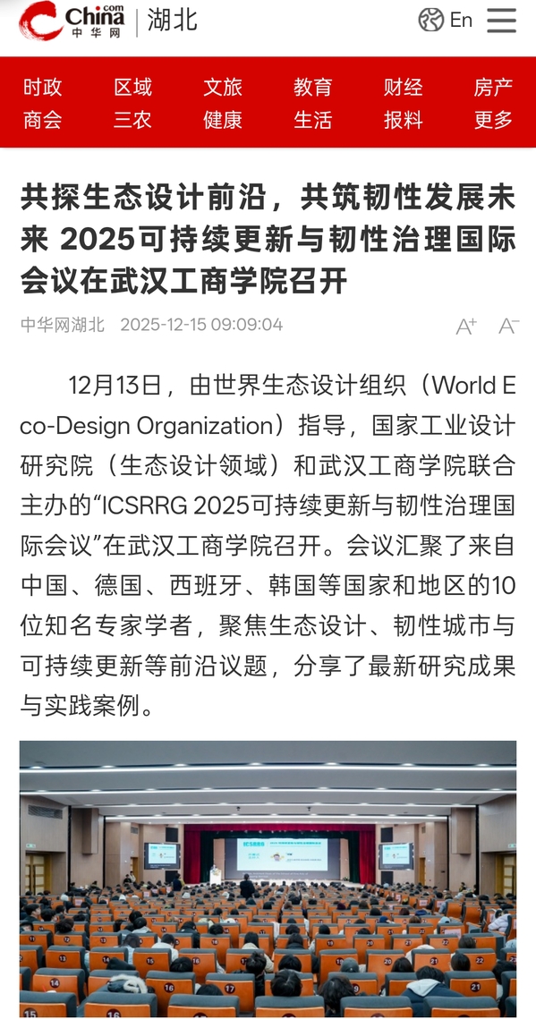 12月13日,由世界生态设计组织(World Eco-Design Organization)指导,国家工业设计研究院(生态设计领域)和武汉工商学院联合主办的“ICSRRG 2025可持续更新与韧性治理国际会议”在武汉工商学院召开。会议汇聚了来自中国、德国、西班牙、韩国等国家和地区的10位知名专家学者,聚焦生态设计、韧性城市与可持续更新等前沿议题,分享了最新研究成果与实践案例。