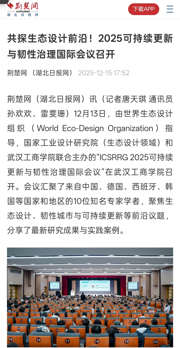 荆楚网(湖北日报网)讯(记者唐天琪 通讯员孙欢欢、雷雯珊)12月13日,由世界生态设计组织(World Eco-Design Organization)指导,国家工业设计研究院(生态设计领域)和武汉工商学院联合主办的“ICSRRG 2025可持续更新与韧性治理国际会议”在武汉工商学院召开。会议汇聚了来自中国、德国、西班牙、韩国等国家和地区的10位知名专家学者,聚焦生态设计、韧性城市与可持续更新等前沿议题,分享了最新研究成果与实践案例。