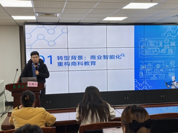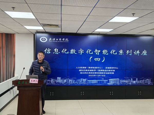 新闻中心讯(特约记者 高丽丽 李萱)12月18日下午,由武汉工商学院人力资源部(教师发展中心)、实验教学中心、虚拟仿真实验教学一流课程虚拟教研室联合主办的“信息化数字化智能化”第四场讲座在弘德楼1016会议室举行。本次讲座特邀中云国创数据科技有限公司创始人、CEO王一民担任主讲嘉宾,以《从数据到智能:构建面向AI时代的商科人才培养新范式》为主题,深入探讨了人工智能背景下商科教育的转型路径与实施策略。来自校内9个教学单位的40余名教师,以及湖北民办高校经管类实践教学创新联盟10所成员高校的23名教师代表共同参与学习交流。