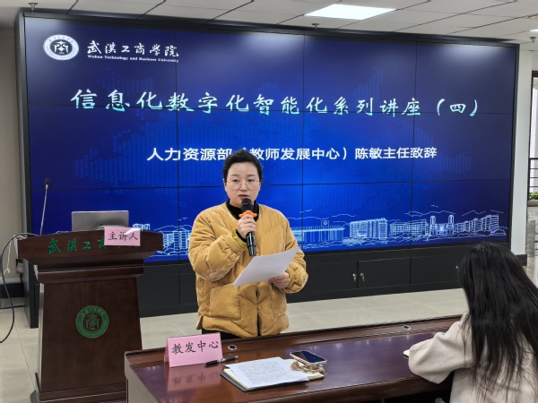 人力资源部副部长陈敏致欢迎辞。她指出,人工智能正深刻改变各行各业,推动教育尤其是商科教育的智能化转型,培养适应新质生产力发展的复合型人才,已成为高校服务社会、实现高质量发展的必然选择。学校近年来在校企协同育人、课程融合创新等方面积极探索,但仍面临师资数字化能力有待提升、人才培养与产业需求衔接不畅等挑战,她希望本次讲座能为广大教师提供学习平台与交流契机,推动教育教学改革向纵深发展。