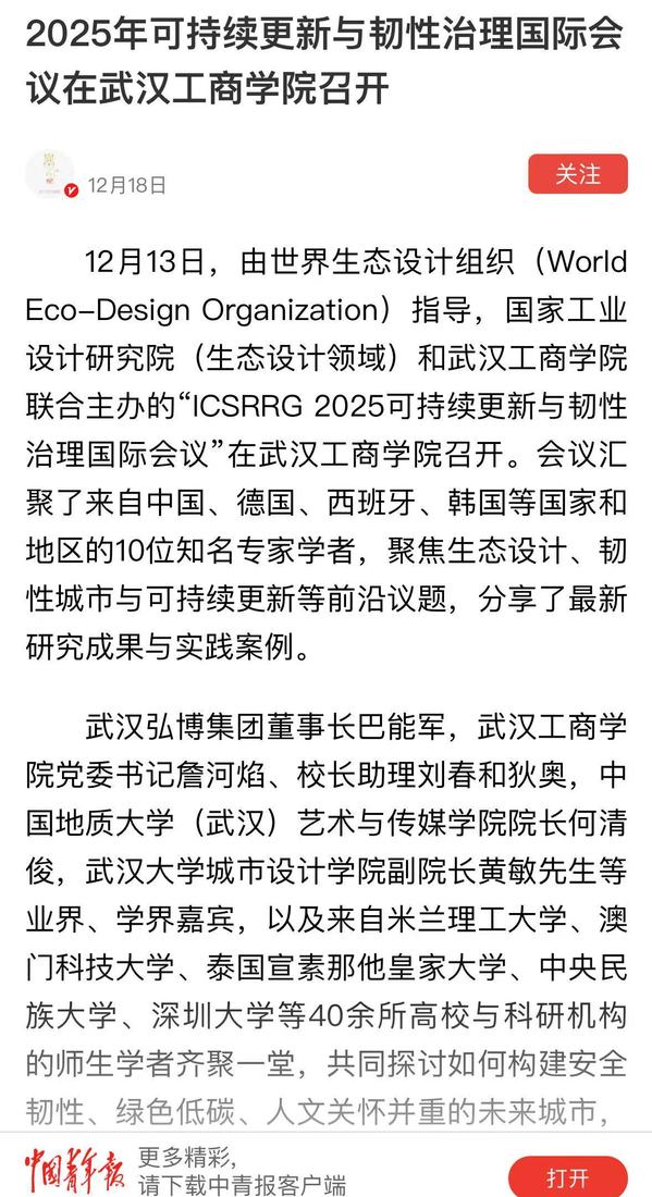 12月13日,由世界生态设计组织(World Eco-Design Organization)指导,国家工业设计研究院(生态设计领域)和武汉工商学院联合主办的“ICSRRG 2025可持续更新与韧性治理国际会议”在武汉工商学院召开。会议汇聚了来自中国、德国、西班牙、韩国等国家和地区的10位知名专家学者,聚焦生态设计、韧性城市与可持续更新等前沿议题,分享了最新研究成果与实践案例。