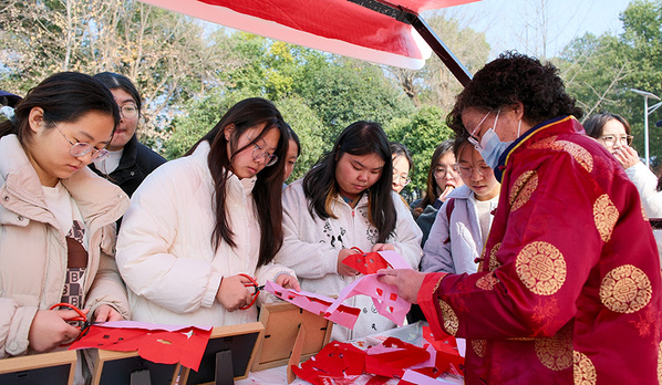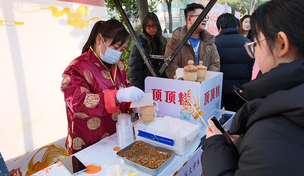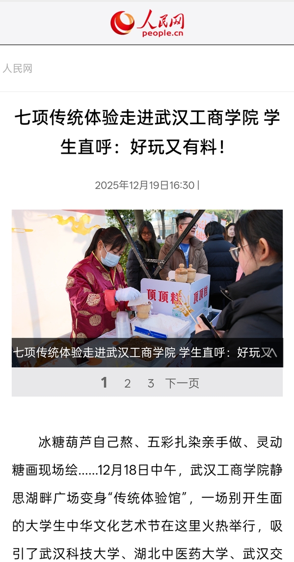 冰糖葫芦自己熬、五彩扎染亲手做、灵动糖画现场绘……12月18日中午,武汉工商学院静思湖畔广场变身“传统体验馆”,一场别开生面的大学生中华文化艺术节在这里火热举行,吸引了武汉科技大学、湖北中医药大学、武汉交通职业学院等周边多所高校的学生们排队体验,亲手“触摸”传统文化。