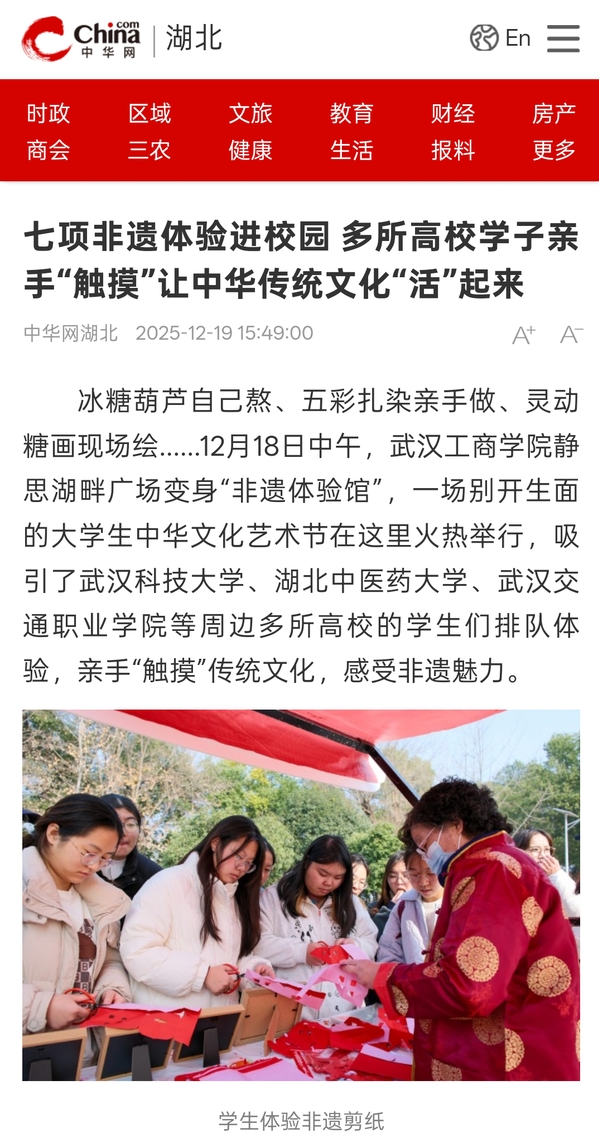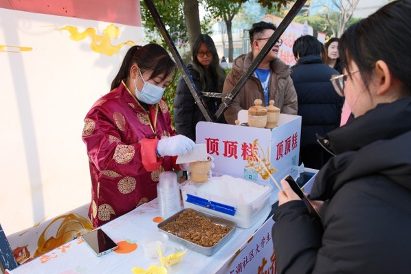 冰糖葫芦自己熬、五彩扎染亲手做、灵动糖画现场绘……12月18日中午,武汉工商学院静思湖畔广场变身“非遗体验馆”,一场别开生面的大学生中华文化艺术节在这里火热举行,吸引了武汉科技大学、湖北中医药大学、武汉交通职业学院等周边多所高校的学生们排队体验,亲手“触摸”传统文化,感受非遗魅力。