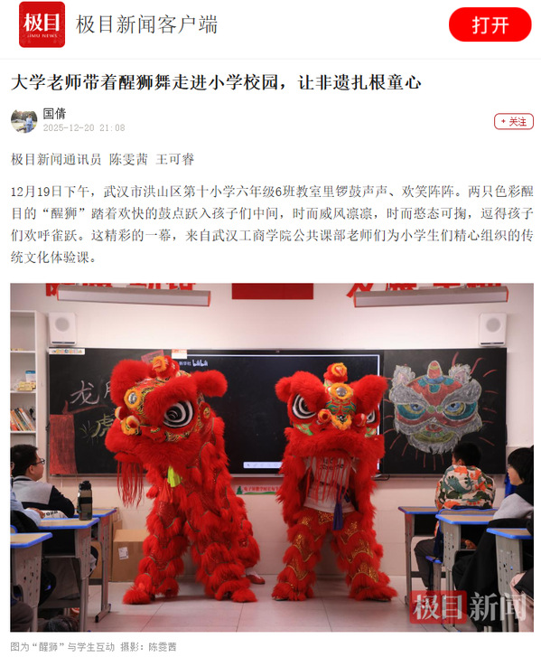 “醒狮承载着民族的情感和记忆,引导孩子亲手制作、亲身感受,就是给孩子们心中播下文化认同的种子。”武汉工商学院公共课部副主任李晶表示。此次活动是武汉工商学院推动非遗走进基础教育的一次实践,通过高校和小学联动,拓展了文化育人的新路径。
