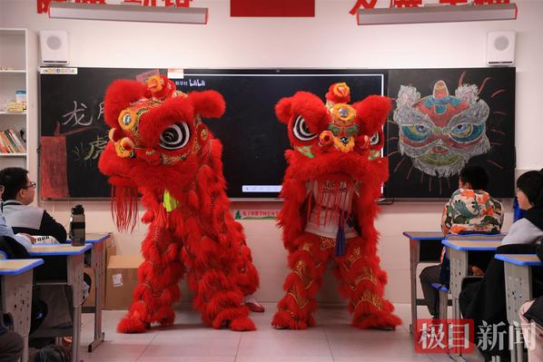 随后的舞狮表演将气氛推向高潮。由武汉工商学院精英龙狮社4名大学生扮演的两只“狮子”活灵活现,穿梭于课桌之间,孩子们笑声不断,纷纷上前与“狮子”亲密互动,现场气氛热烈。