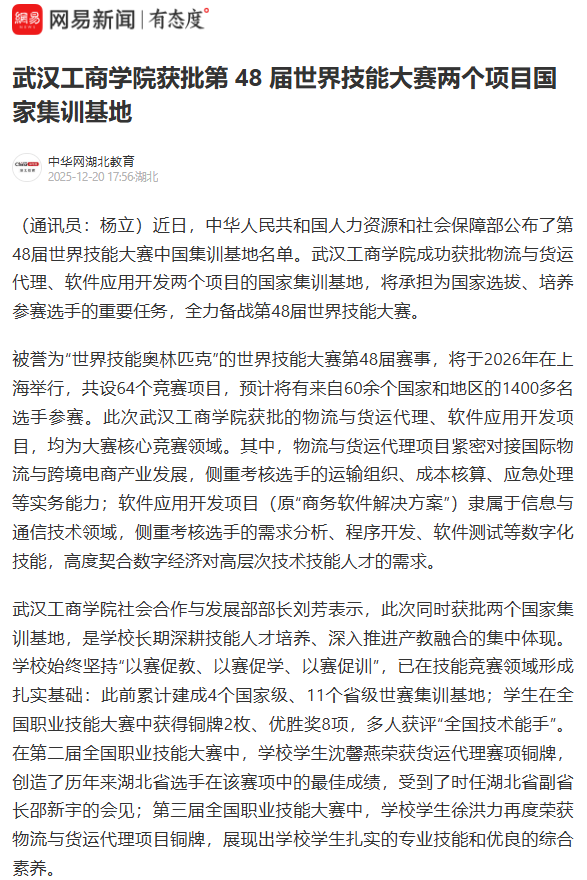 “连续多次获批世赛国家集训基地,是人社部对我校相关领域高技能人才培养与系统化训练实力的权威认可。”武汉工商学院副校长巴能强表示,学校将严格按照人社部要求,科学制定集训方案,优化训练资源配置,全面锤炼选手技能、塑造过硬心理素质、开拓国际视野,全力选拔、培育优秀选手出征世赛。同时,学校将以基地建设为契机,推动世赛成果向教学资源转化,辐射带动区域物流、数字技术、软件开发等相关领域技能人才培养水平整体提升,为国家技能强国建设和区域产业转型升级提供有力支撑。