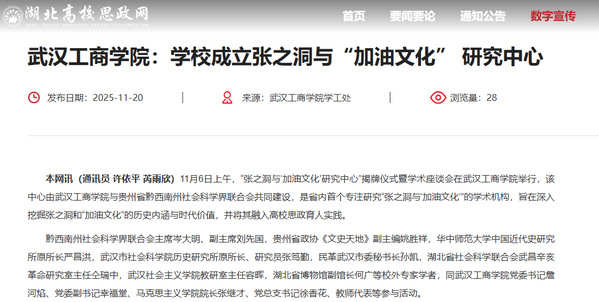 本网讯(通讯员 许依平 芮雨欣)11月6日上午,“张之洞与‘加油文化’研究中心”揭牌仪式暨学术座谈会在武汉工商学院举行,该中心由武汉工商学院与贵州省黔西南州社会科学界联合会共同建设,是省内首个专注研究“张之洞与‘加油文化’”的学术机构,旨在深入挖掘张之洞和“加油文化”的历史内涵与时代价值,并将其融入高校思政育人实践。