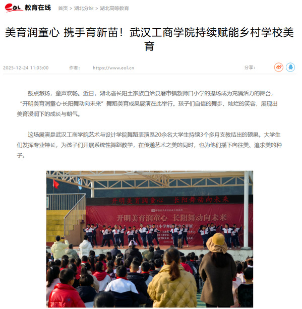 据悉,此次活动是武汉工商学院将“课程教学、实践活动、校园文化、艺术展演”四位一体美育体系延伸至乡村学校的具体举措。下一步,学校将继续与救师口小学深化合作,完善长效帮扶机制,持续为乡村美育注入优质资源与创新活力,助力更多孩子在感知美、创造美的过程中全面发展、健康成长。(通讯员:雷雯珊 蓝静)