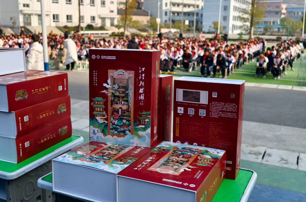 展演现场,武汉工商学院还向学校捐赠了35件由艺术与设计学院师生设计制作的《江汉揽胜图》立体书立。这份“可捧在手心的武汉记忆”,既是一堂生动的美育实践课,也为城乡学子之间搭建起可观可感的文化交流桥梁。