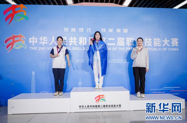 图为武汉工商学院学生沈馨燕(右一)摘得第二届全国职业技能大赛物流与货运代理项目铜牌