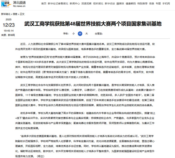 “连续多次获批世赛国家集训基地,是人社部对我校相关领域高技能人才培养与系统化训练实力的权威认可。”武汉工商学院副校长巴能强表示,学校将严格按照人社部要求,科学制定集训方案,优化训练资源配置,全面锤炼选手技能、塑造过硬心理素质、开拓国际视野,全力选拔、培育优秀选手出征世赛。同时,学校将以基地建设为契机,推动世赛成果向教学资源转化,辐射带动区域物流、数字技术、软件开发等相关领域技能人才培养水平整体提升,为国家技能强国建设和区域产业转型升级提供有力支撑。(杨立)