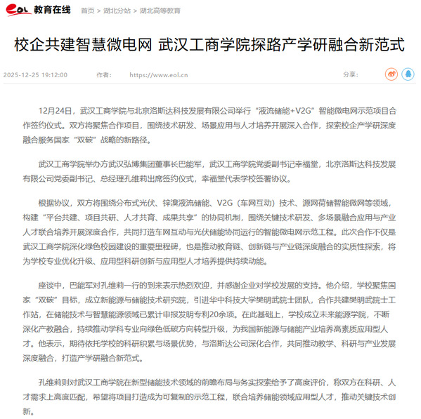12月24日,武汉工商学院与北京洛斯达科技发展有限公司举行“液流储能+V2G”智能微电网示范项目合作签约仪式。双方将聚焦合作项目,围绕技术研发、场景应用与人才培养开展深入合作,探索校企产学研深度融合服务国家“双碳”战略的新路径。
