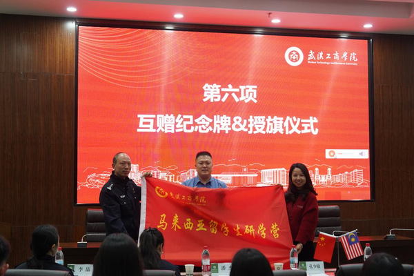 会上,孔少敏与潘杰共同为研学行授旗,标志着“智汇荆楚·文商共融——马来西亚学子武汉工商研学行”活动正式开启。未来7天,全体营员将通过专题授课、实践实训、校园与企业参访等多种形式,不断拓宽网络与新媒体、智慧物流、工商管理等专业学科领域的视野,进一步了解中国高校的教育模式与发展成就。