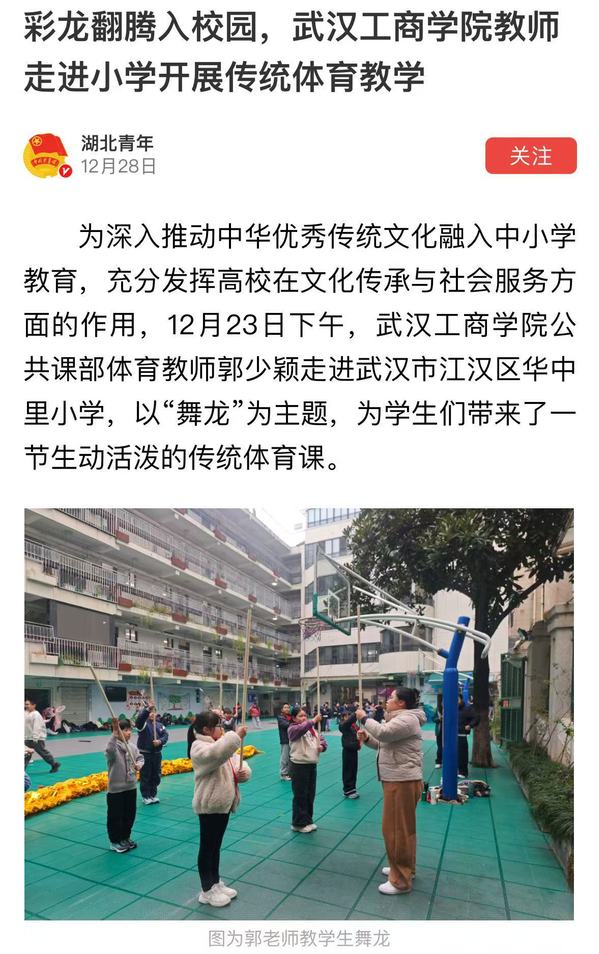 为深入推动中华优秀传统文化融入中小学教育,充分发挥高校在文化传承与社会服务方面的作用,12月23日下午,武汉工商学院公共课部体育教师郭少颖走进武汉市江汉区华中里小学,以“舞龙”为主题,为学生们带来了一节生动活泼的传统体育课。